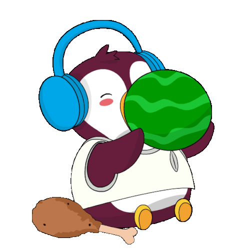 A cute pudgy penguin wearing headphones, happily enjoying a chicken drumstick, perfect for expressing hunger or a love for food.