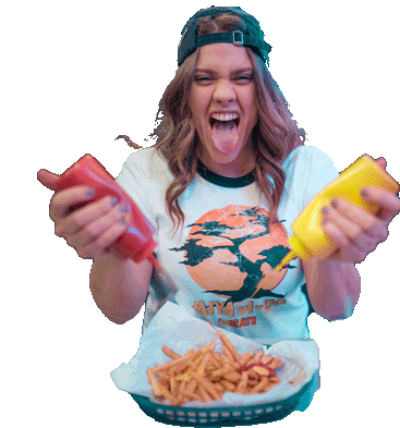 A person enthusiastically squirts ketchup and mustard onto food, with a 'WOW' graphic appearing.