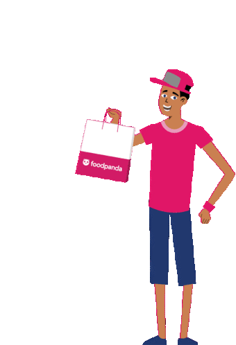 A cheerful Foodpanda delivery person, wearing a pink shirt and cap, holds a Foodpanda bag, ready to deliver.
