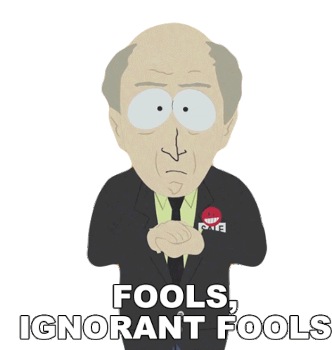 A South Park character, Marvin Marsh, blinks while declaring 'FOOLS, IGNORANT FOOLS' with a stern expression.