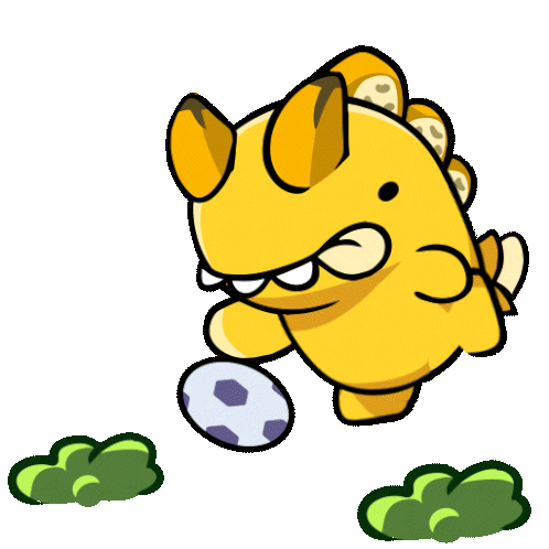 A cute yellow Frutti Dino character energetically kicks a football, ready to score a goal. Perfect for sports fans and game enthusiasts.