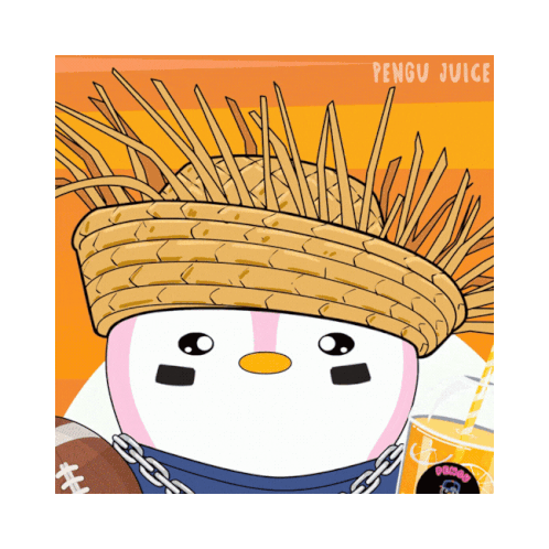 a cartoon of a penguin wearing a straw hat next to a penguin juice cup