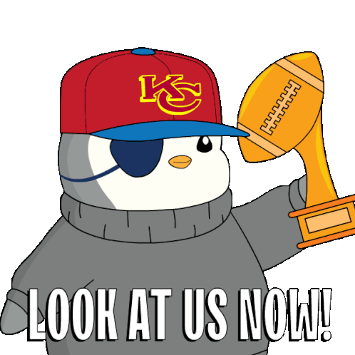 A Pudgy Penguin in a Kansas City Chiefs cap celebrates a Super Bowl victory with a trophy, exclaiming 'LOOK AT US NOW!', referencing Tom Brady's legacy.