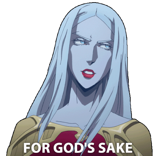Carmilla from Castlevania expresses exasperation, saying "For God's sake," with a flash of fangs.