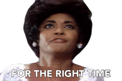 Nancy Wilson reacts with wide-eyed surprise, then a knowing expression, as the phrase 'FOR THE RIGHT TIME' appears.