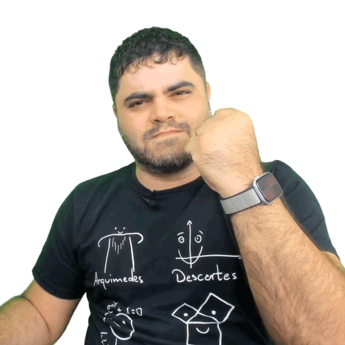 Rafael Procopio, o professor de Matemática Rio, exibe um sorriso confiante e um punho cerrado, transmitindo força e determinação.