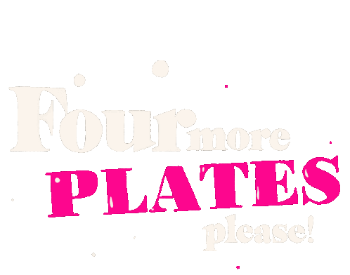 A vibrant graphic sticker displaying the phrase 'Four more PLATES please!' in English and Hindi.