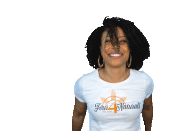 Shalita Grant proudly shows off her Type4 hair, then gives a double thumbs up while wearing a Four Naturals shirt.