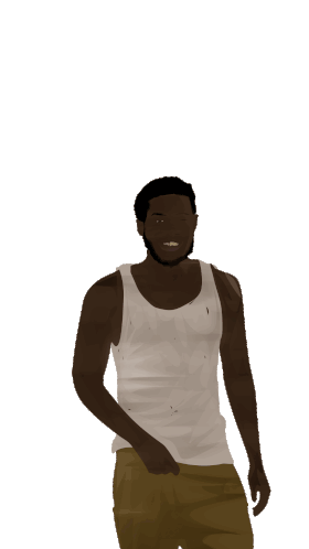 Franklin Saint from Snowfall Series smiles, wearing a white tank top and brown pants, with a slight head tilt.