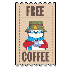 An animated sticker of a 'FREE COFFEE' coupon featuring a cute penguin in a hat and glasses, holding a steaming cup.