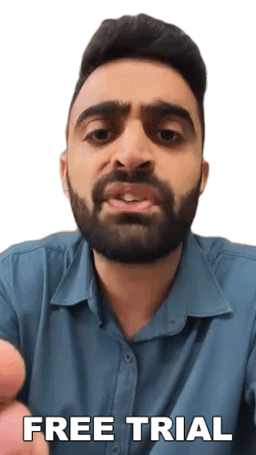 Comedian Rahul Dua enthusiastically promotes a 'Free Trial' offer, gesturing directly to the viewer.