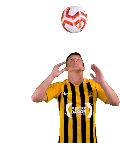 A male soccer player, Vitinha, in a yellow and black striped jersey, performs freestyle toques by heading an orange and white ball.
