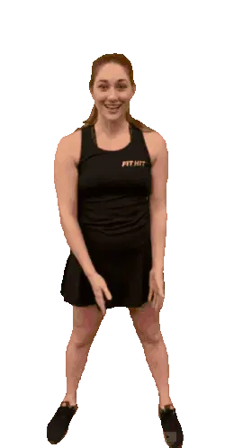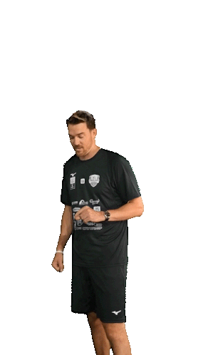 Loic Geiler, coach for Frejus Volley, celebrates with a triumphant fist pump. He wears a black team shirt and shorts.
