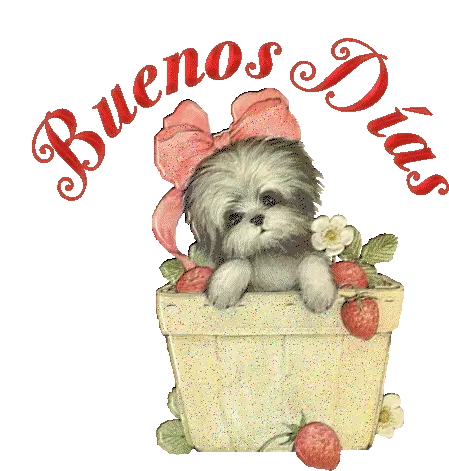 A cheerful Fresa Fresasglaseadas strawberry character greets with "¡Buenos Días!" and open arms, perfect for a happy morning message.