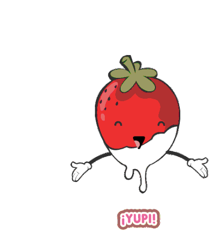 A cheerful cartoon glazed strawberry with arms outstretched, exclaiming '¡YUPI!' below, perfect for joy.