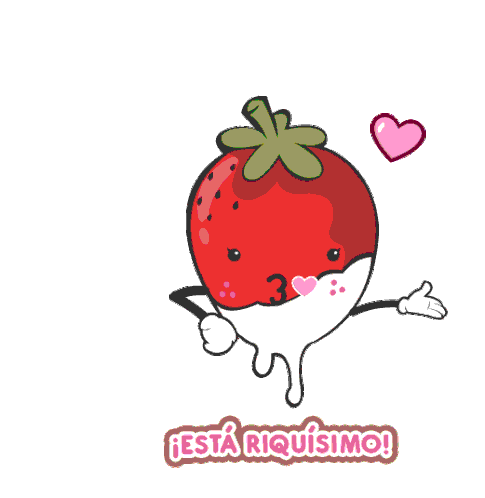A cute cartoon strawberry, dipped in white glaze, winks and blows a kiss with the caption '¡Está Riquísimo!'