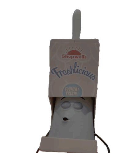 Freshlicious, the juice box character from Sausage Party, looks around with a sassy and curious expression.