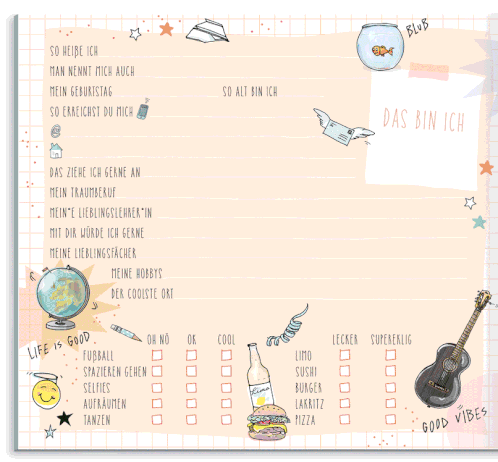 Animated sticker of a German friendship book page, featuring prompts about personal details, hobbies, and preferences.