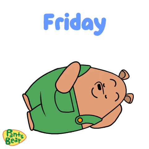 A sleepy Pants Bear cartoon character rests on its back, celebrating Friday and the start of the weekend.