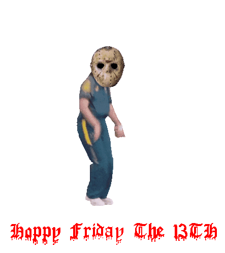 Jason Voorhees in a blue jumpsuit dances to celebrate Friday the 13th, with "Happy Friday The 13th" text.
