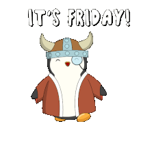 A cheerful penguin in a viking helmet and robe celebrates the end of the week with 'IT'S FRIDAY!' text.