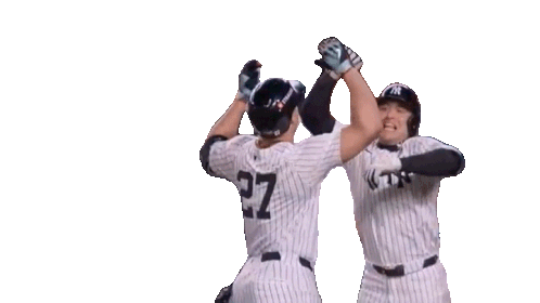Anthony Volpe and Giancarlo Stanton of the New York Yankees celebrate a play with a high-five.