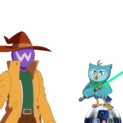 Wiz, the purple-faced character, and an owl friend engage in an epic Star Wars lightsaber duel atop an R2-D2 head.