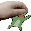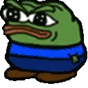 Peepo the frog, with an angry and sad expression, jiggles slightly while wearing a blue shirt and brown shoes.