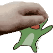 An adorable animated sticker featuring a cartoon frog being gently held in a human hand.