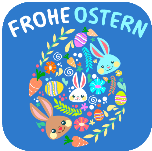 Celebrate Easter with this vibrant sticker featuring cute bunnies, colorful eggs, and carrots, wishing 'Frohe Ostern!'
