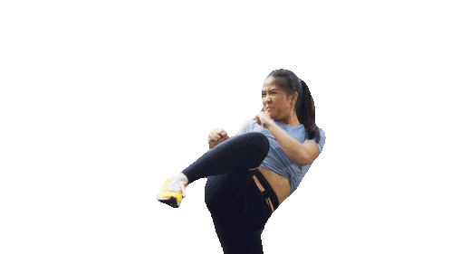 Minh Kwan executes a powerful, high front kick with precision and intensity, showcasing martial arts skill and strength.