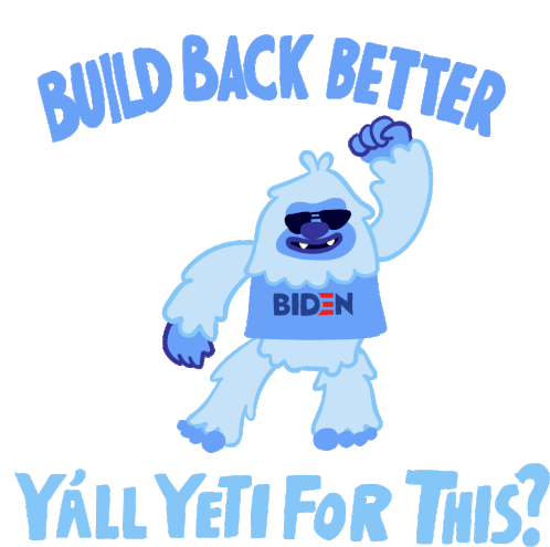 A cool yeti wearing "Biden" sunglasses and shirt flexes, promoting "Build Back Better" with the slogan "Y'all Yeti For This?".