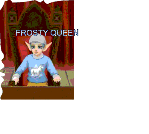Frosty Queen, an animated character from Star Stable Online, sits regally on a throne, wearing a unicorn sweatshirt.