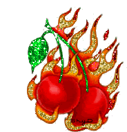Two vibrant red cherries engulfed in sparkling golden flames, with a glittery green stem and leaf.