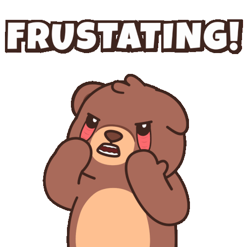 A cute brown cartoon bear looks incredibly frustrated, clenching its fists, with the word 'FRUSTRATING!' displayed above its head.