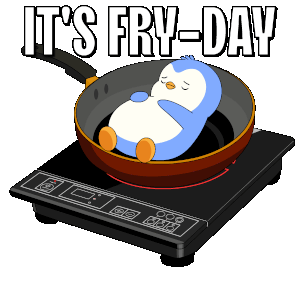 A cute penguin, possibly Pudgy or Pengu, relaxes in a frying pan on an induction cooktop, celebrating "IT'S FRY-DAY!".