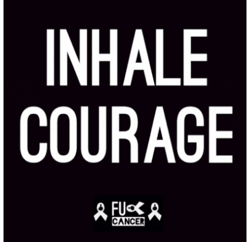 Animated sticker showing 'EXHALE FEAR' and 'FUCK CANCER' with defiant ribbons and middle finger gestures, symbolizing courage against the disease.