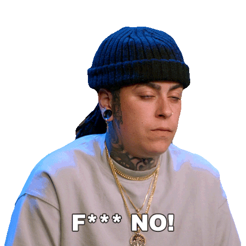 a woman wearing a beanie and a sweater with the words f *** no on it