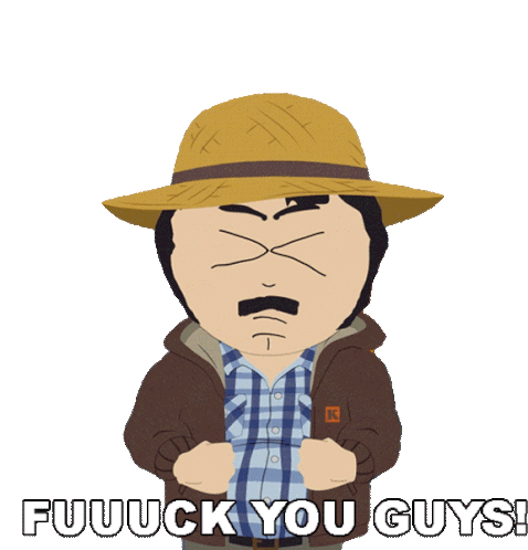 Randy Marsh from South Park, wearing a straw hat, angrily says 'Fuuuck you guys!' while raising his middle fingers.