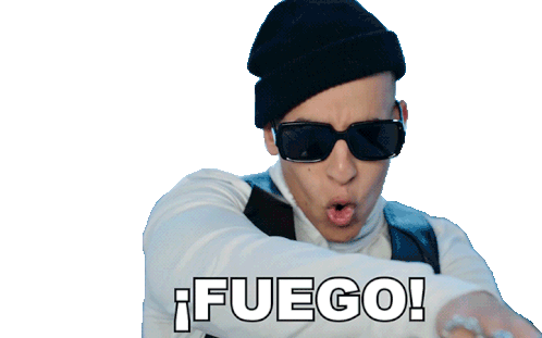 Daddy Yankee passionately exclaims '¡FUEGO!' with an intense expression, pointing forward. A dynamic reaction sticker.