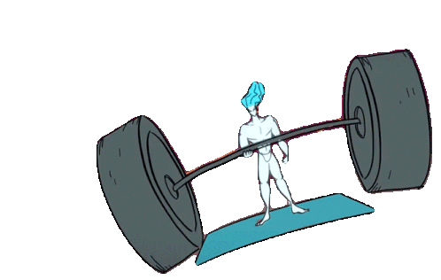 Zeus, from Destripando La Historia by Pascu Y Rodri, flexes his strength, lifting an enormous barbell on a yoga mat.