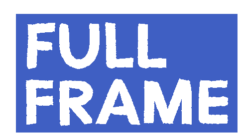 A bold white 'FULL FRAME' text logo on a solid blue background, presented as an animated sticker.