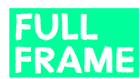 A bold white 'FULL FRAME' text logo is displayed against a vibrant green background, creating a clean and striking design.