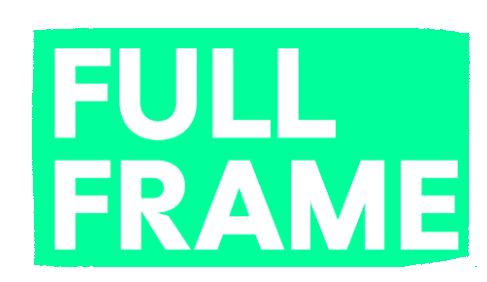 A vibrant green and white graphic logo displaying the words 'FULL FRAME' in bold, uppercase letters.