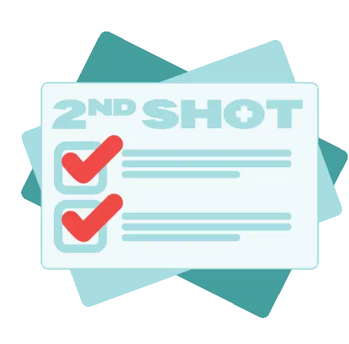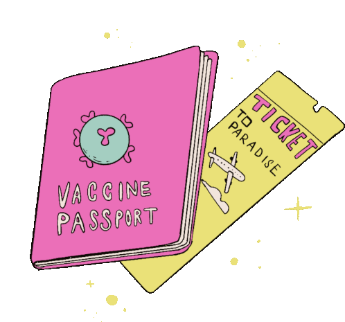 An animated sticker showing a pink vaccine passport with a virus icon and a yellow 'Ticket to Paradise' airplane boarding pass, symbolizing freedom to travel after vaccination.