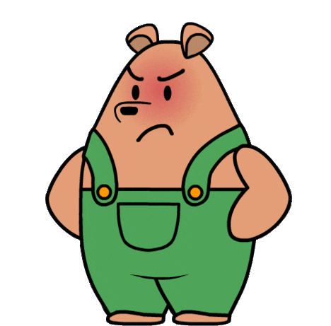 A cartoon bear in green overalls expresses intense anger, fuming with rage and upset.