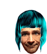 A funny sticker featuring Bolinger's face with a vibrant purple wig, expressing a playful and crazy mood.