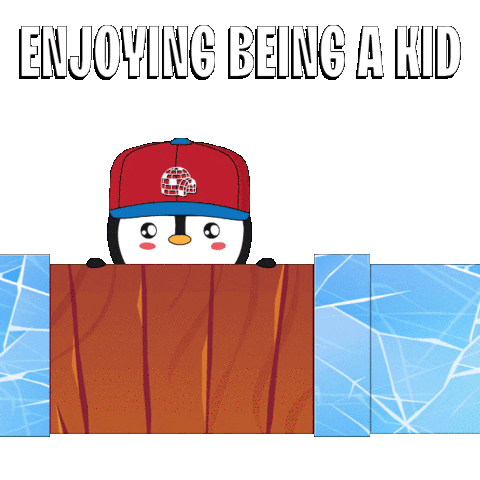 A cheerful cartoon penguin in a red cap peeks over a fence, with the text 'ENJOYING BEING A KID' above, celebrating childhood joy.