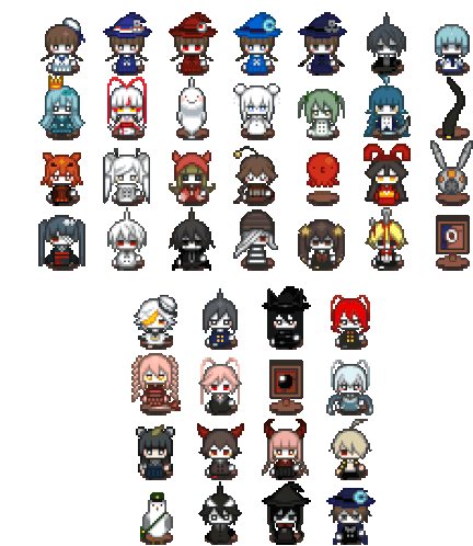 A collection of pixel art characters from Funamusea (Okegom) works, featuring various iconic designs.
