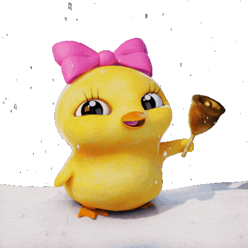 Lola the chick, a cute yellow character with a pink bow, rings a jingle bell for Christmas in the snow.